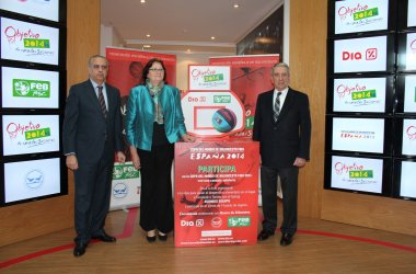 27/02/2014 09:12:43 Ana María Llopis, presidenta del Consejo de Administración de DIA, José Luis Sáez, presidente de la Federación Española de Baloncesto (FEB) y José Antonio Busto Villa, presidente de la Federación Española de Bancos de Alimentos (FESBAL), han presentado en el Espacio 2014, la sede de la Copa del Mundo de Baloncesto 2014, la campaña "Objetivo: 2014 kilos de Canastas Solidarias".