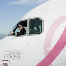 El 'Avión Rosa' de LAN exhibe el característico lazo símbolo de la lucha contra esta enfermedad, llevando la Campaña Contra el Cáncer de Mama por toda Sudamérica