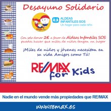 01/07/2013 09:28:08 RE/MAX España, red internacional de franquicias inmobiliarias, hace un positivo balance del desarrollo en los diez primeros meses de existencia de su nueva acción de Responsabilidad Social Corporativa a favor de Aldeas Infantiles SOS.