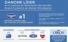 07/06/2017 08:37:00 Danone ha logrado por tercer año seguido la primera posición en el ranking general de fabricantes Brand Footprint, desarrollado por Kantar Worldpanel, que analiza las marcas más compradas por los españoles en 2016. Según el estudio desarrollado por Kantar, Danone supera los 300 millones de contactos anuales con el consumidor y es la compañía que más marcas incluye en el ranking, hasta un total de siete marcas.