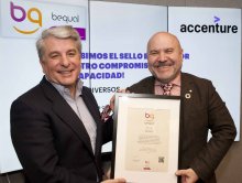 16/12/2019 08:27:06 Accenture ha sido reconocida con el Sello Bequal Plus que otorga la Fundación Bequal, y que certifica su política de inclusión de las personas con discapacidad. El presidente de Accenture, Juan Pedro Moreno, ha recibido el Sello Bequal de manos de Luis Cayo Pérez, presidente de la Fundación Bequal, en un acto que tuvo lugar en la sede de Accenture en Torre Picasso (Madrid).