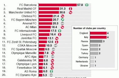 15/09/2010 08:00:00 El FC Barcelona es el equipo que más seguidores tiene en Europa, según arroja el último estudio de la consultora alemana Sport+Markt, publicado el pasado viernes, y además por un margen muy amplio: 57,8 millones de fans frente a los 31,3 del Real Madrid o los 30,6 del Manchester United, equipo que cierra el podio de los clubes más populares.