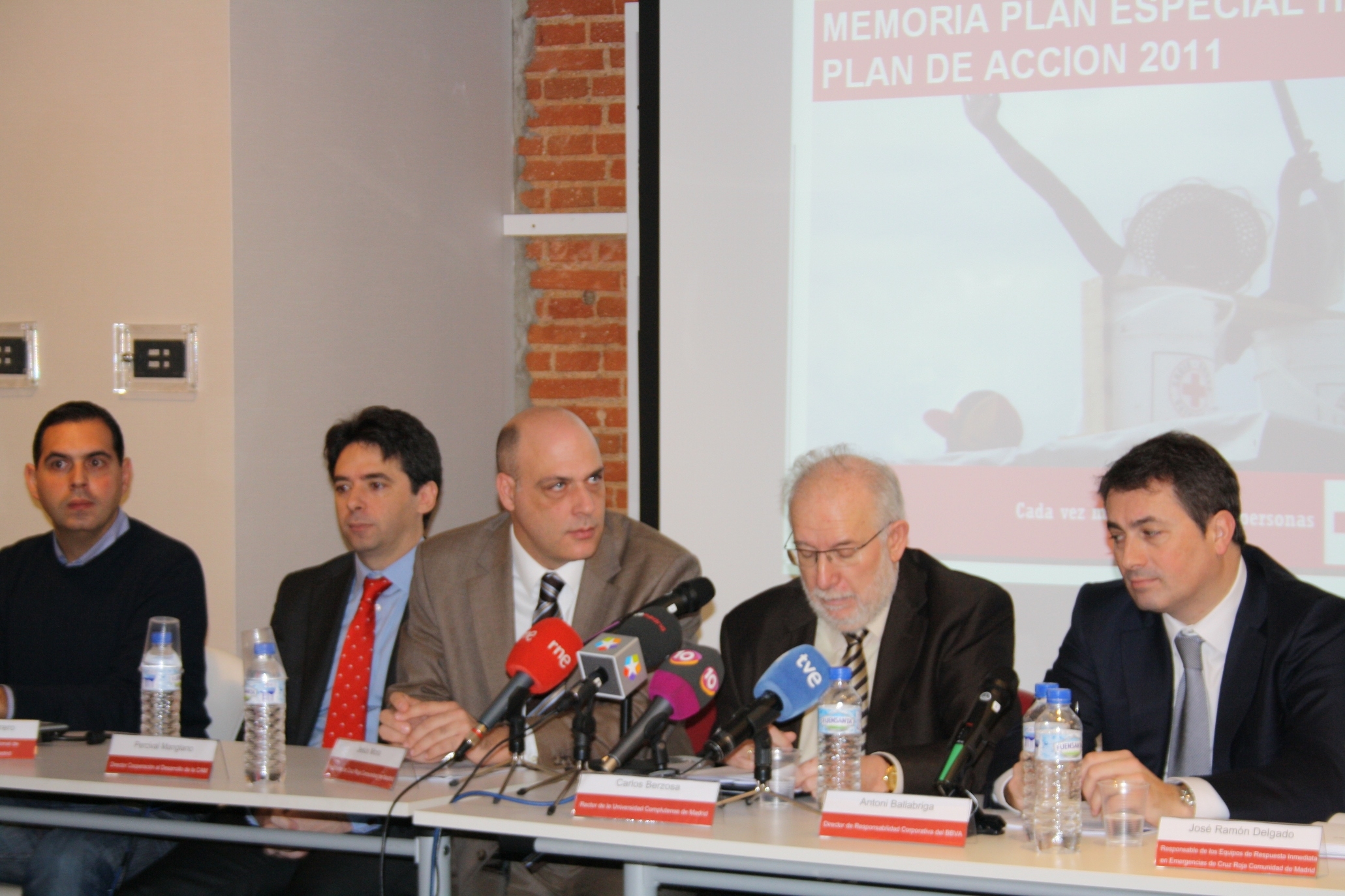De esta forma, el presidente de Cruz Roja Comunidad de Madrid, Jesús Mora, ha estado acompañado por Percival Manglano, director de Cooperación al Desarrollo de la Comunidad de Madrid; Antoni Ballabriga, director de Responsabilidad Corporativa de BBVA y Carlos Berzosa, rector de la Universidad Complutense de Madrid. Todos ellos quisieron destacar muy especialmente la solidaridad de la ciudadanía de Madrid y posteriormente, cada uno de ellos señaló las áreas de colaboración que están desarrollando en el país. Así, Percival Manglano señaló que la Comunidad de Madrid creó un fondo de 1,5 millones de euros que se han repartido entre Ayuda Humanitaria y cuatro proyectos de reconstrucción, que se centrarán fundamentalmente en la infancia.