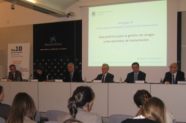 La apertura de la jornada ha corrido a cargo del subdirector general de Responsabilidad Corporativa y Marca de “la Caixa”, Ángel Pes, quien ha señalado la importancia del Principio 10 para el desarrollo de una economía sostenible. Pes ha hecho una reflexión sobre los riesgos a los que se enfrentan las entidades derivados de la corrupción como las penalizaciones legales, sanciones económicas o daño reputacional. Asimismo, Ángel Pes recordaba que la única manera de fortalecer la confianza es potenciar la transparencia y la comunicación con los grupos de interés y controlar los riesgos a priori, y no cuando el delito ya se ha cometido.