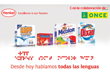 La implementación del etiquetado se ha ido incorporando de manera progresiva a los productos de Henkel Ibérica ubicando los textos en braille en la parte inferior izquierda de los envases de cartón. La información que se incluye es: nombre de la marca, la variedad, las dosis y finalmente la categoría a la que pertenece el producto (Ej: Pastillas lavavajillas, Detergente lavadora, etc.).