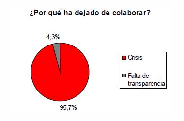 Al preguntar por qué han reducido o finalizado esta colaboración, un rotundo 95,7% responde que el motivo ha sido la crisis y el descenso de sus recursos económicos. Un residual 4,3% achaca el fin de la colaboración a la falta de transparencia de la entidad en cuestión.