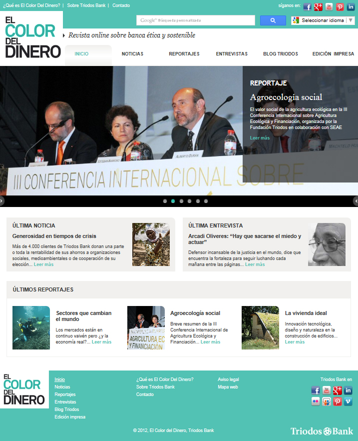 El Color del Dinero online reflejará las últimas novedades de la banca ética y sostenible, además de contar con las entrevistas y reportajes que se publican trimestralmente en la edición papel. La revista tiene la finalidad de explicar los proyectos financiados por el banco, así como temas relacionados con el desarrollo sostenible. Sonia Felipe, directora de Comunicación de Triodos Bank, apunta que: “Esta revista persigue convertirse en un medio más actualizado y vivo que la edición en papel“. La edición digital sigue teniendo el objetivo de ser una plataforma de comunicación y diálogo con los clientes y los grupos de interés.