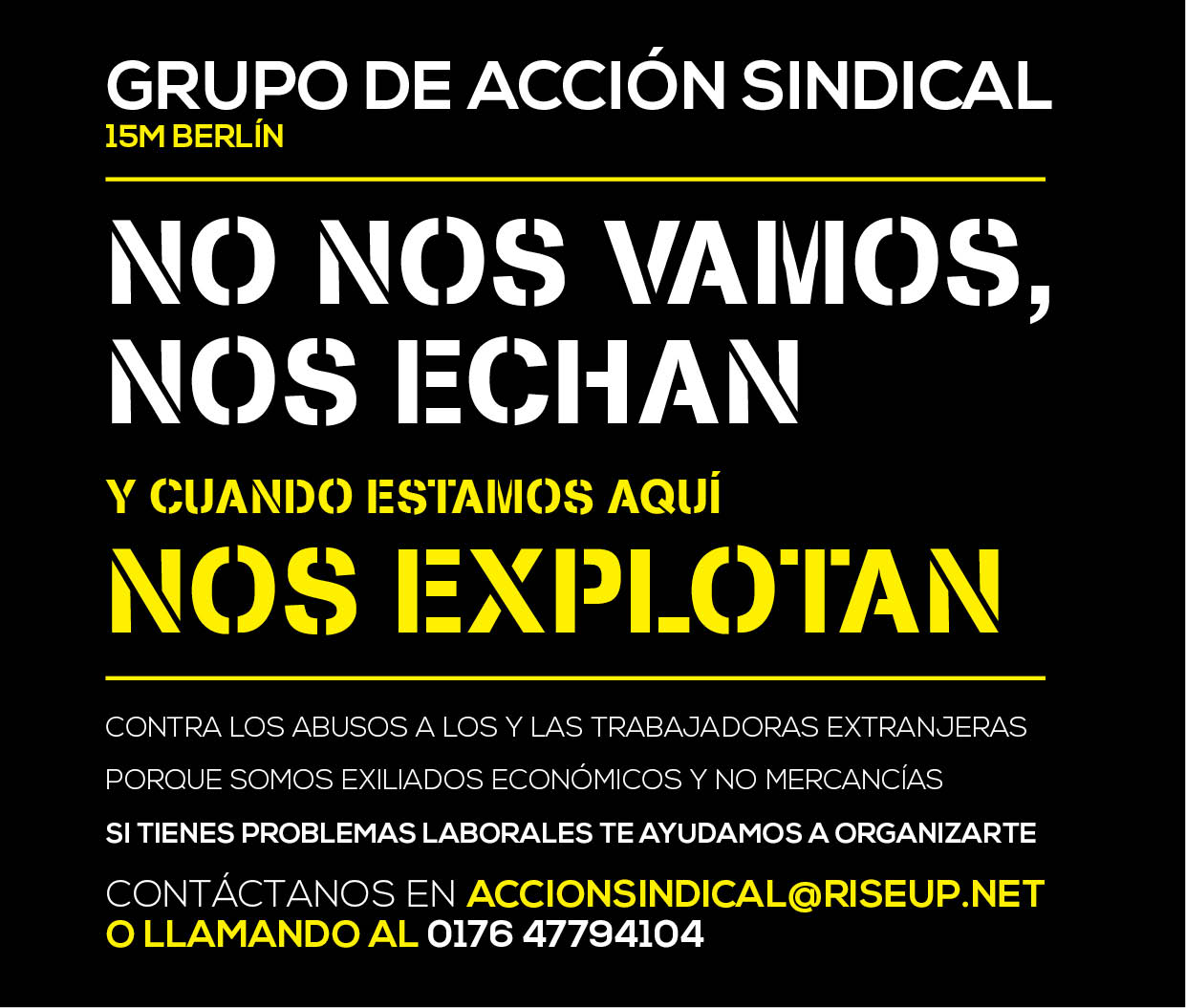 Surgido de la asamblea del 15M de Berlín y a través de una asesoría creada en setiembre del año pasado pensada para dar información sobre los pasos a seguir o los trámites burocráticos una vez llegados a Berlín, el grupo se dedica “al apoyo de trabajadores y trabajadoras para organizarse colectivamente en sus lugares de trabajo”. Quieren, entre otros, acabar con los abusos laborales contra los migrados a Berlín; ayudar a la organización de las plantillas de las empresas; mejorar sus condiciones de trabajo; establecer vínculos con los sindicatos alemanes; colaborar para eliminar el desequilibrio de derechos entre trabajadores de diferentes nacionalidades o impulsar campañas que cierren el paso a la utilización de trabajadores migrados en la empresa para disminuir los derechos del conjunto de la plantilla.
