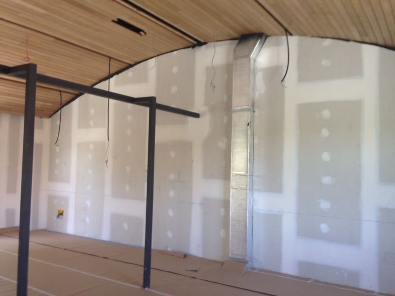 Además también se han usado Placostic para unos enlucir algunos espacios, la placa Glasroc H para zonas de semintemperie, y la placa Placo Impact en zonas de mayor tránsito.