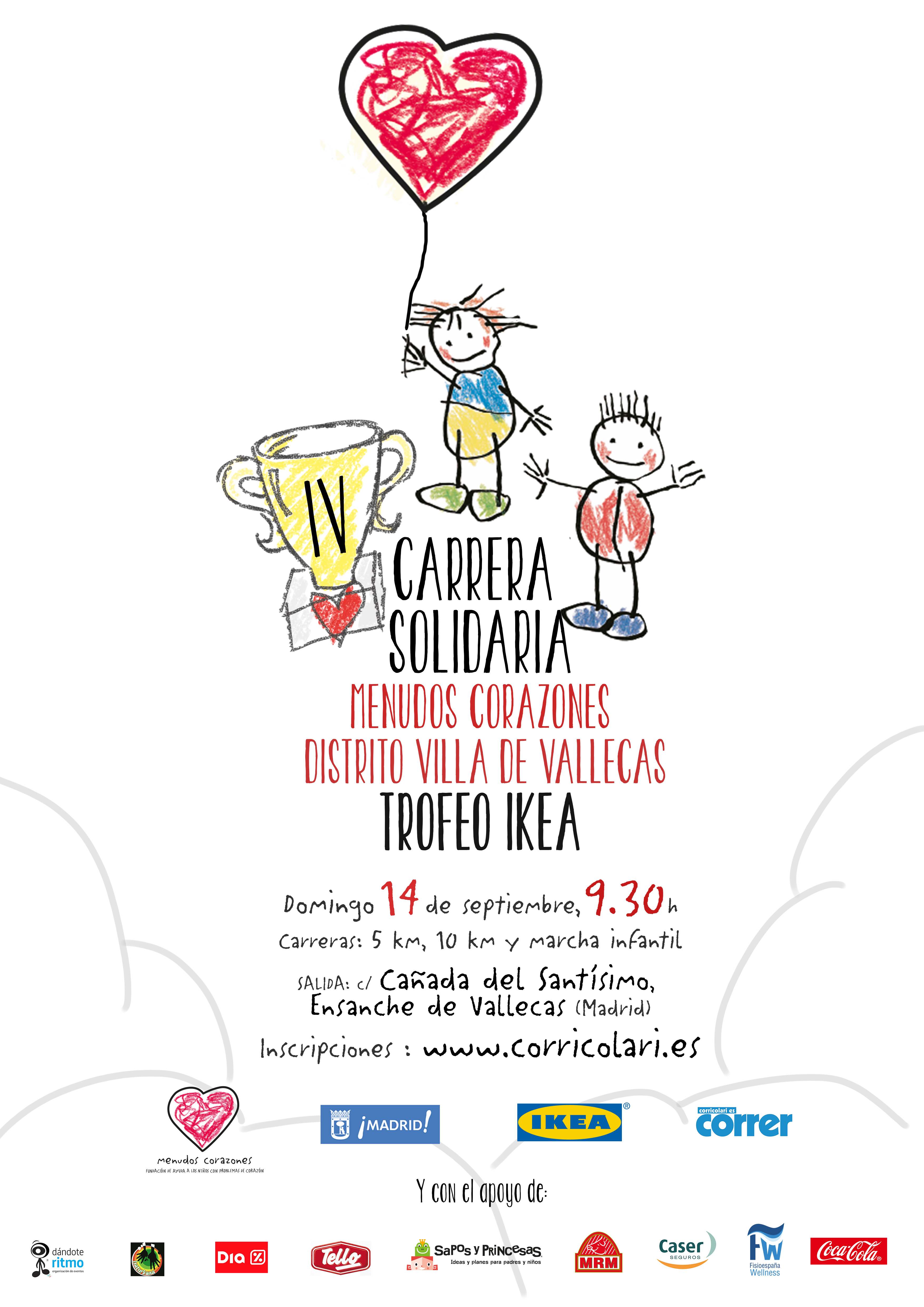 Además de la colaboración de las entidades organizadoras, la IV Carrera Solidaria Menudos Corazones Distrito Villa de Vallecas Trofeo IKEA cuenta con el apoyo de otras empresas solidarias, como MRM, Tello, Caser Seguros, Dia, Sapos y Princesas.com, Coca-Cola Iberian Partners, FisioEspaña Wellness, Baturkana y Dándote Ritmo, entre otras.