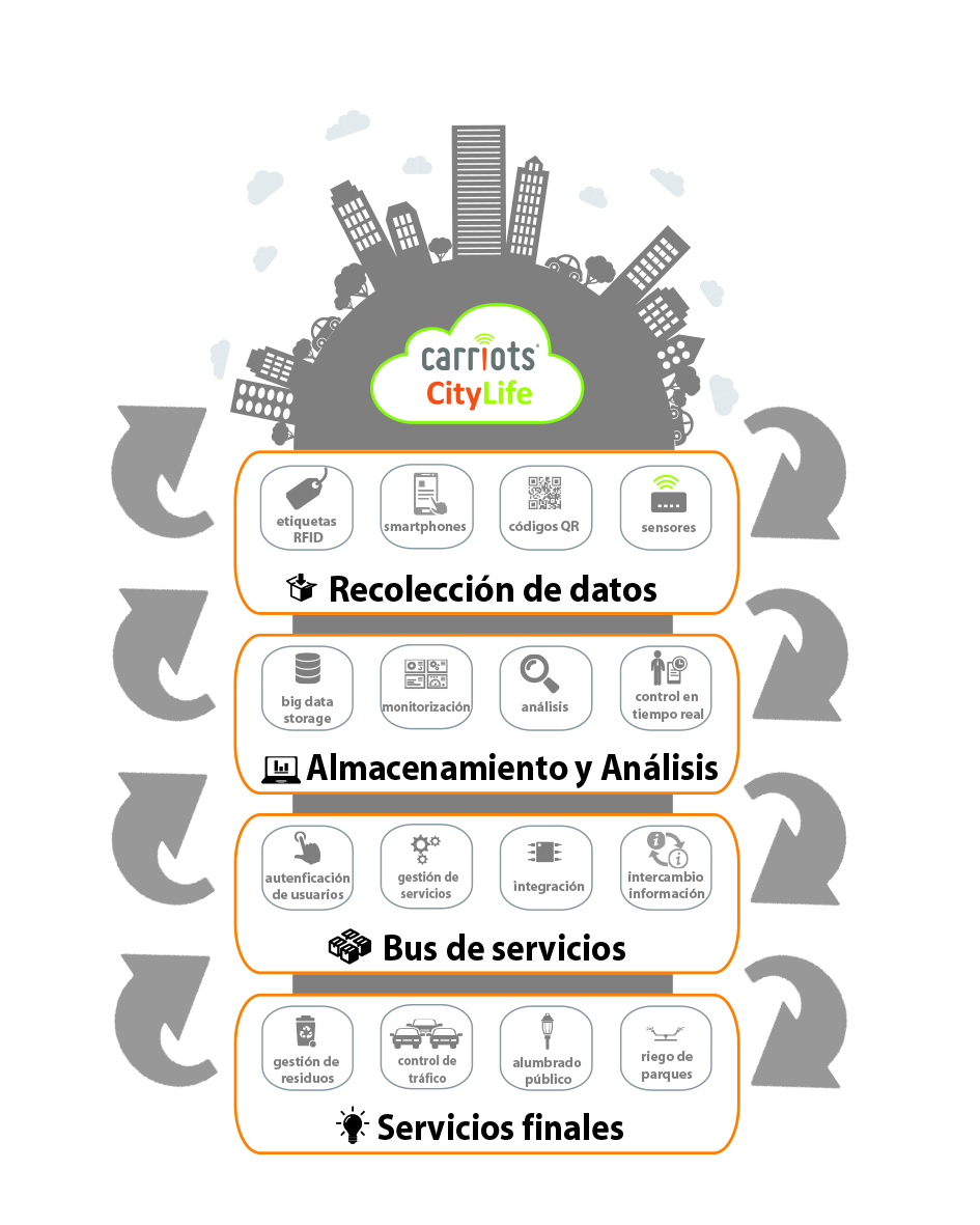 CarriotsCityLife ofrece una solución integrada que permite monitorizar y gestionar los servicios y sistemas de la ciudad de una forma más inteligente gracias a una visión única y centralizada de las operaciones. Así, el Ayuntamiento conocerá lo que ocurre en la ciudad en tiempo real y podrá actuar de forma inmediata para anular el riego automático en días de lluvia, encender las farolas cuando haya niebla o reducir el gasto energético en sus dependencias. Además, pondrá a disposición de los ciudadanos información en tiempo real de las plazas de parking libres y aplicaciones gratuitas de guiado a las mismas.
