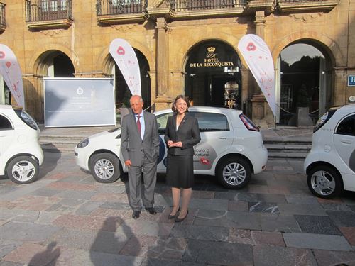 En el acto celebrado en el Hotel de la Reconquista de la capital asturiana el presidente de la Fundación EDP, Nicanor Fernández, ha hecho entrega a la directora de la Fundación Príncipe de Asturias, Teresa Sanjurjo, de los tres vehículos respetuosos con el medio ambiente.