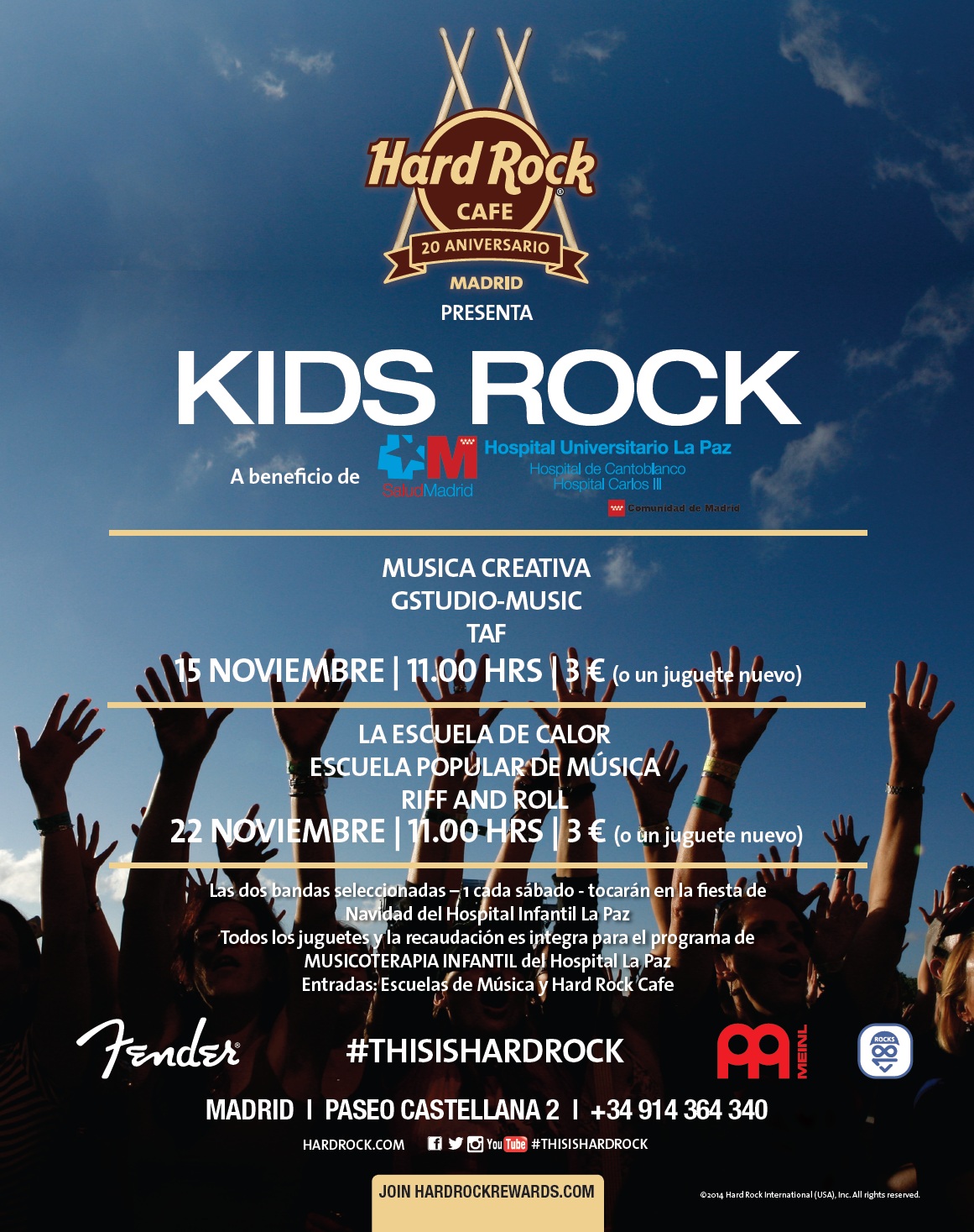Las dos escuelas a las que pertenezcan las bandas ganadoras recibirán una guitarra de Hard Rock Cafe Madrid para que puedan seguir formando a sus jóvenes estudiantes.El único requisito para disfrutar del concierto es abonar 3€ o bien donar un juguete nuevo para niños menores de 12 años.