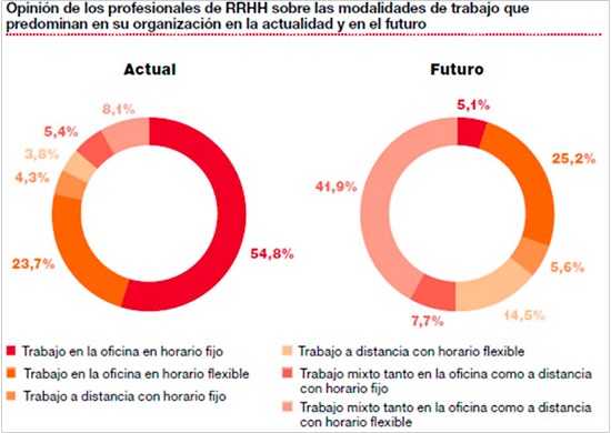 Tendremos más autoempleo -freelance- y contratación a tiempo parcial; el mercado laboral será el mundo; la gente cambiará más de trabajo; trabajar a la vez para varias compañías o empleadores distintos será algo cotidiano; y los profesionales serán más internacionales y emprendedores. Los directores de Recursos Humanos de las principales compañías españolas encuestados para el informe aseguran, en un 42%, que el trabajo mixto, tanto en la oficina como a distancia en horario flexible, será la modalidad laboral que predomine en las compañías españolas en 2033, en detrimento, principalmente, del trabajo fijo en la oficina. Y un 54% espera que aumente significativamente la frecuencia de cambio de empresas por parte de los profesionales del futuro.