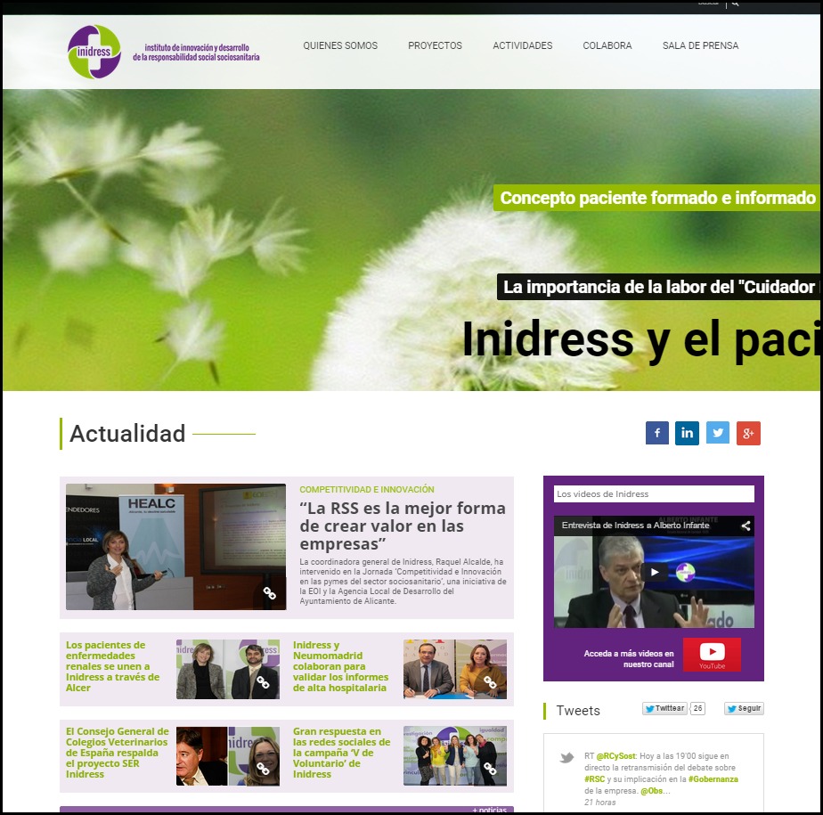 Dentro del área de comunicación, Inidress cuenta con varios espacios en los que dar a conocer todo la información de Responsabilidad Social Sociosanitaria, de ámbito público y privado, y todo lo concerniente a los pacientes, además de su canal de Youtube y sus perfiles en diferentes redes sociales como son Facebook, Twitter, Google+ y Linkedin.