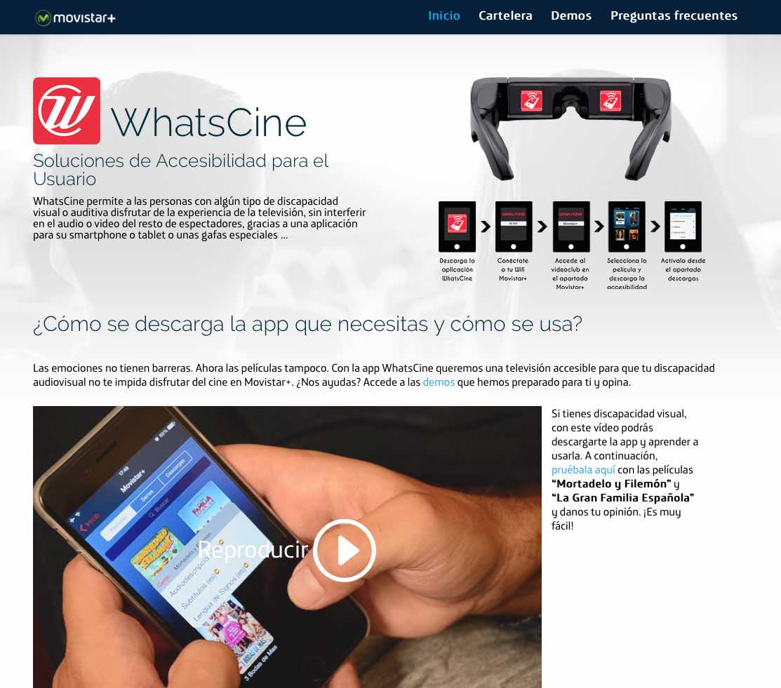 Desde principios de agosto, la plataforma Movistar+ ofrece películas en formato accesible a través de la app WhatsCine sin ningún coste adicional, pues el precio del alquiler no varía. Así, aquellos que son clientes de Movistar+ pueden consumir largometrajes accesibles como “La conspiración de noviembre”, “El hombre más enfadado de Brooklyn” o “Tarzán”, que ya figuran en una parrilla, que irá aumentando su oferta cada semana.