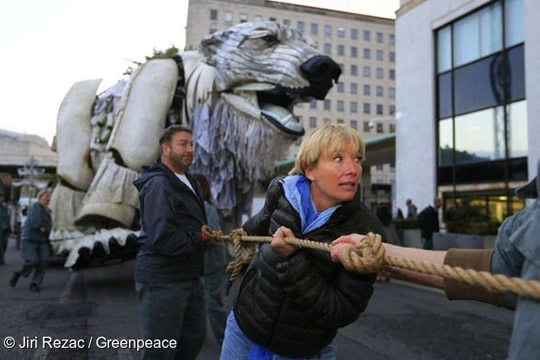 La actriz británica Emma Thompson se unió a esta protesta y se hizo presente en el lugar, donde interpretó un poema dirigido a los jefes de Shell (que ella misma escribió para la ocasión) y declaró que ella va a ser la primera en romper una orden judicial que prohíbe al staff de Greenpeace Reino Unido ingresar al edificio Shell. Emma intentará hacer entrar a las oficinas una huella de oso polar impresa que llevará los nombres de algunas de las siete millones de personas que ya se unieron al movimiento Salva el Ártico.
