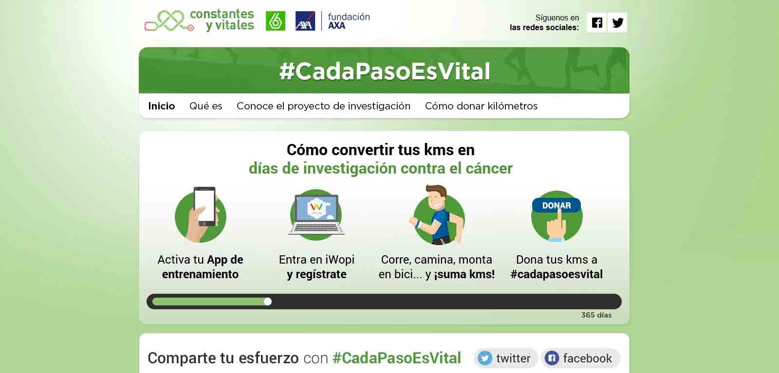 Un paso sencillo, pero vital. Desde ese momento, cada persona formará parte del desafío #CadaPasoEsVital y donará sus kilómetros que se convertirán en días de Investigación. Si entre todos se consigue el reto de llegar a 365 días, Constantes y Vitales donará 100.000 euros para financiar durante un año el proyecto de investigación en metástasis del Centro Nacional de Investigaciones Oncológicas (CNIO) liderado por el joven científico Héctor Peinado.