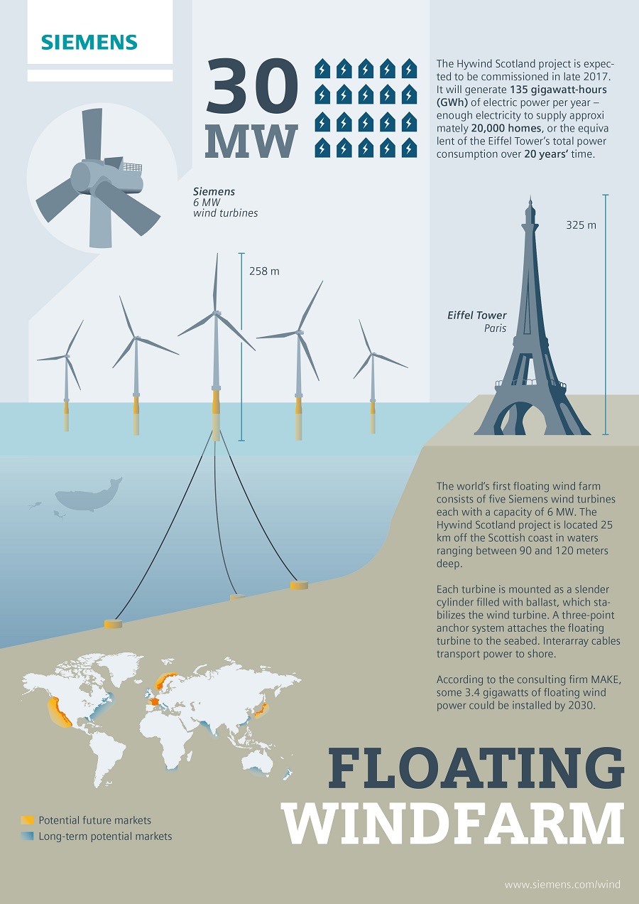 El mayor proyecto eólico flotante del mundo se encuentra en aguas escocesas, a 25 km de la costa de Peterhead, en Aberdeenshire. Está previsto que el montaje de las unidades destinadas al nuevo proyecto Hywind Scotland tenga lugar durante el primer semestre de 2017. En 2009 Statoil y Siemens instalaron con éxito un aerogenerador de 2,3 MW en el primer proyecto eólico flotante a escala real del mundo, Hywind Demo.