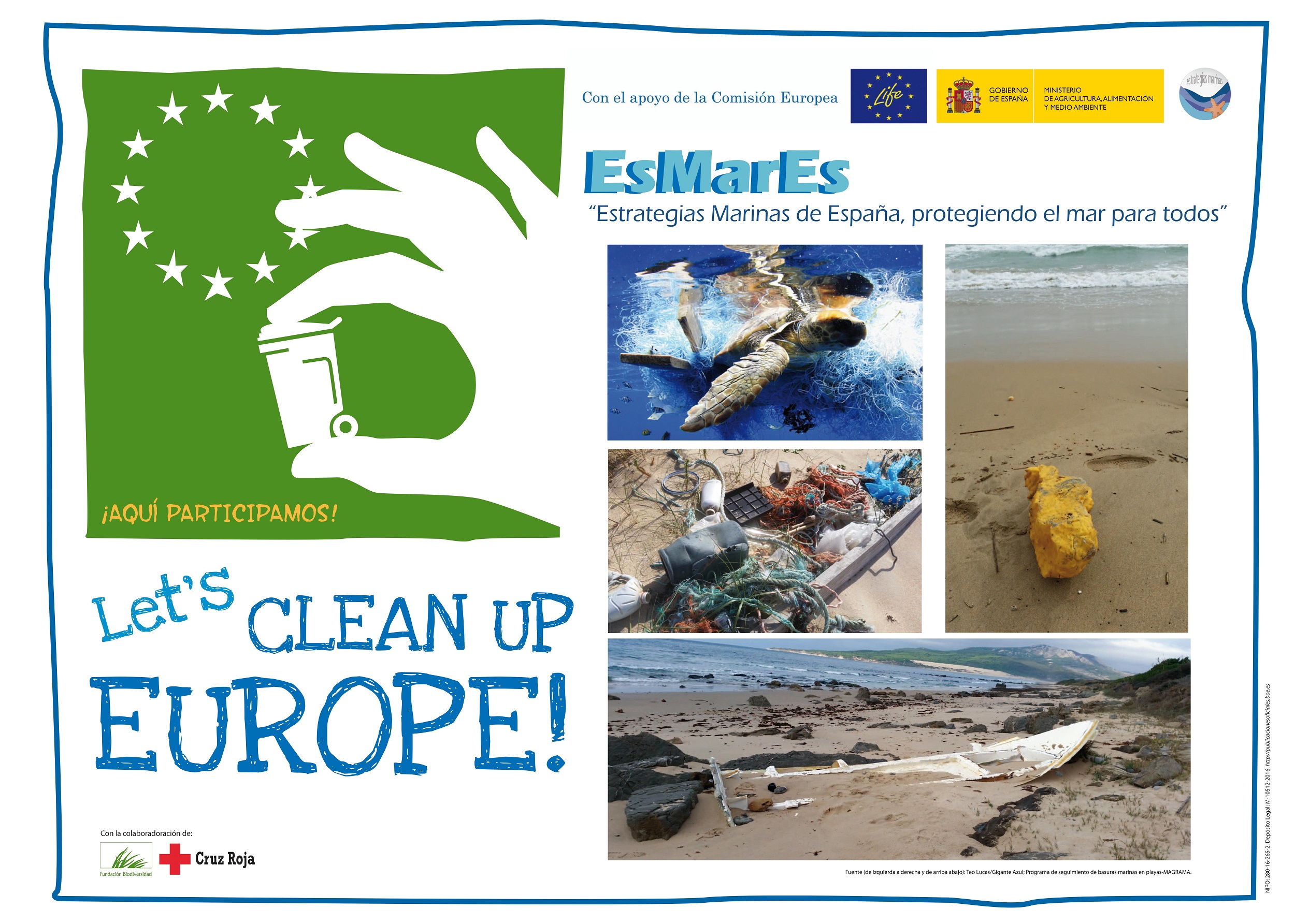 El Ministerio de Agricultura, Alimentación y Medio Ambiente, a través de la Dirección General de Sostenibilidad de la Costa, y sus servicios periféricos, y Cruz Roja española participarán activamente en la campaña 2016 a través del proyecto “participación y voluntariado ambiental en costas”. Este proyecto fue beneficiario de la convocatoria general de proyectos de la Fundación Biodiversidad en 2015 y, entre sus actividades, se enmarcan ocho acciones simultáneas de voluntariado que han tenido lugar durante este fin de semana en diversas playas de Palma de Mallorca, Menorca, Tenerife, A Coruña, Granada, Huelva, Alicante, Valencia y Ceuta, que formarán parte de “Let’s Clean Up Europe”.