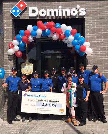 El equipo Domino's Pizza, entregó a Leticia Fernández, responsable de captación de fondos de Fundación Theodora España, un cheque por valor de 23.790 euros que irá destinado a financiar las actividades solidarias de esta organización en los hospitales españoles. En concreto, la Fundación Theodora, a través de sus Doctores Sonrisa, se encarga de llevar la alegría y el optimismo a más de 2.300 niños hospitalizados en 20 centros de toda España.