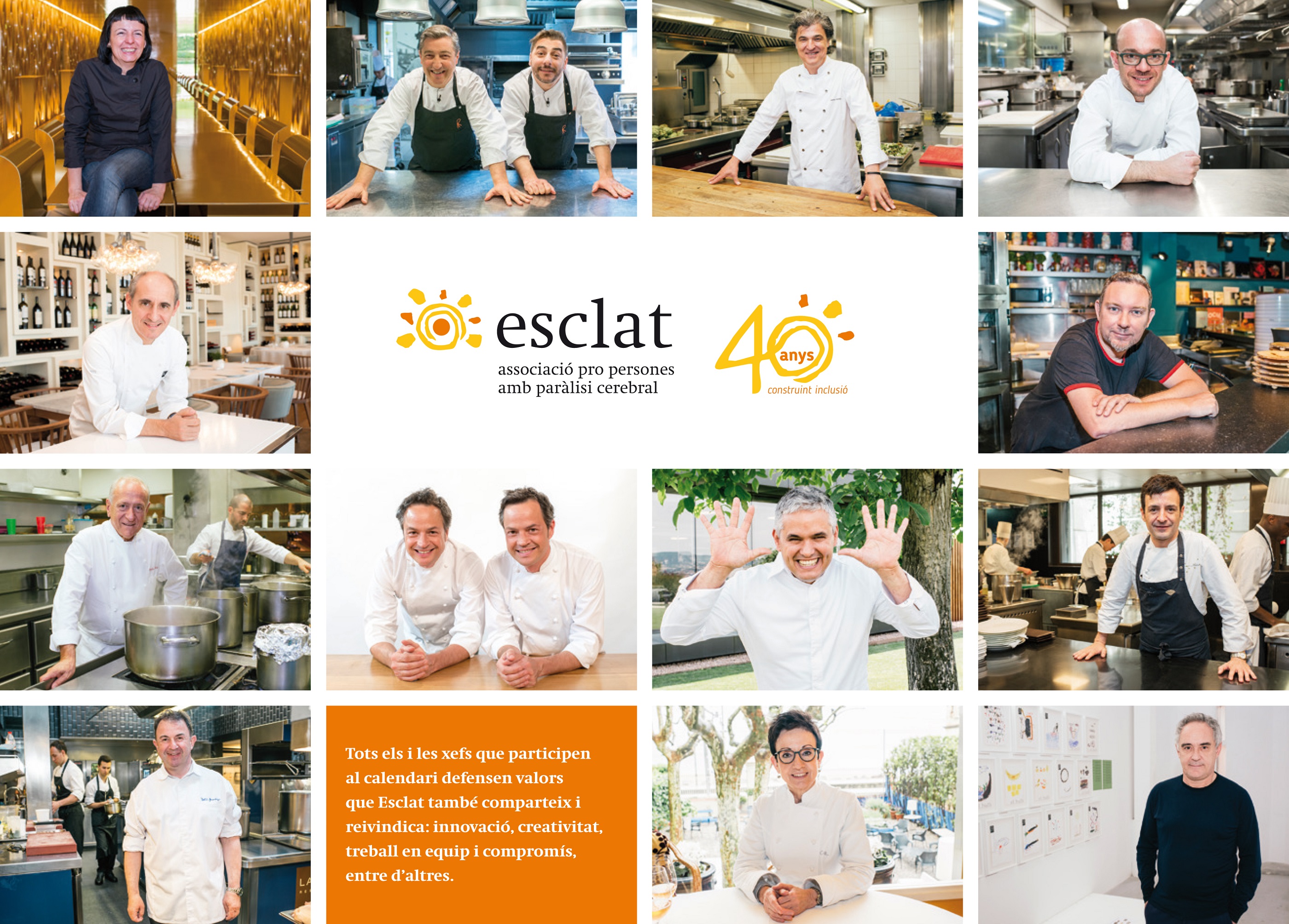 En esta ocasión han participado en el proyecto los chefs Ferran Adrià, Jordi y Joan Roca, Carles Abellan, Paco Pérez, Raúl Balam, Martin Berasategui, Sergi y Xavier Torres, Carles Gaig, Marc Gascons, Fina Puigdevall, Nandu Jubany, Albert Adrià y Carme Ruscalleda. El calendario también se ha materializado gracias a Araceli, Bilel, Dimas, Toni, Carla, Isabella, Alejandro, Iñaki, Laia, Teresa, Amine y Nausica, todos ellos usuarios de los distintos centros de Associació Esclat.