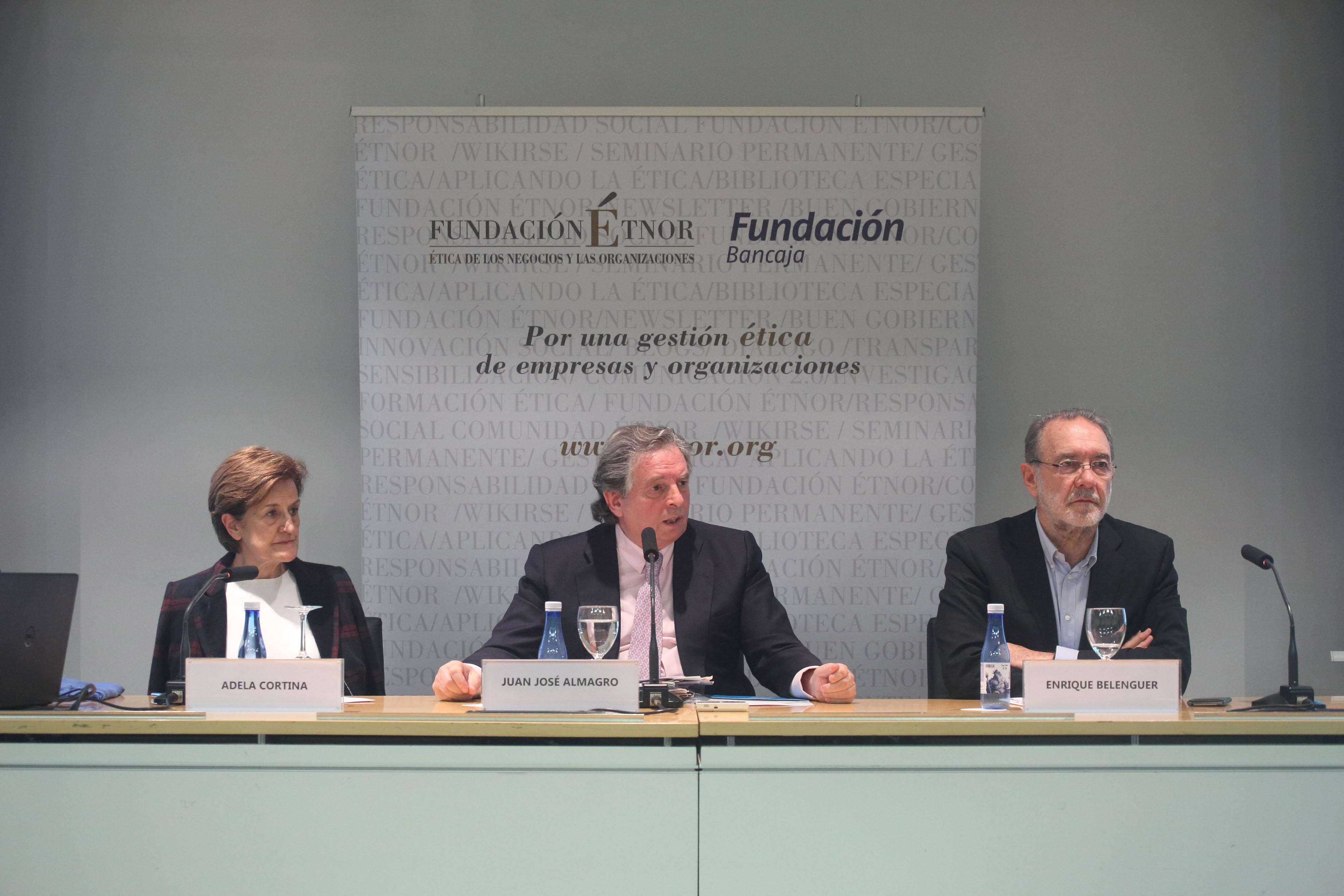 Juan José Almagro, miembro del Consejo de Administración de Mapfre Global y Mapfre Internacional, ha ofrecido una conferencia para hablar del desafío que supone para las empresas y las organizaciones los Objetivos de Desarrollo Sostenible (ODS) en el marco del XXVI Seminario de Ética Económica y Empresarial que organiza la Fundación Étnor y que ha sido presentada por la directora de la Fundación Étnor y catedrática de Ética y Filosofía Política, Adela Cortina, y el presidente de la Fundación Étnor, Enrique Belenguer.