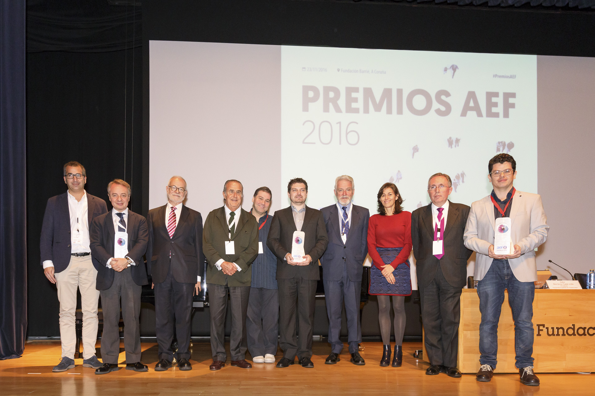 La Fundación Barrié ha acogido la ceremonia de entrega de la primera edición de los premios de la Asociación Española de Fundaciones (AEF), un acto que se enmarca dentro de la VI Conferencia General de la Asociación. El evento ha sido presentado por Adolfo Mendéz, secretario general de la AEF, y ha contado con la participación de Javier Nadal, Amadeo Petitbó y Ana Luisa Millán, presidente y vicepresidentes de la AEF.