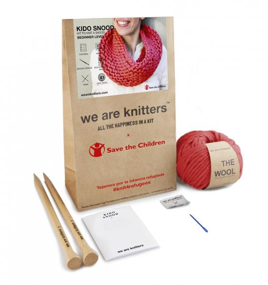 El kit se llama KIDO SNOOD e incluye todo lo necesario para tejer un cuello de lana. El kit, que tiene un precio de 38€, incluye el ovillo del color deseado, dos agujas para tejer de 15 mm, el patrón en el que se explican todos los pasos y una aguja lanera para rematar.
