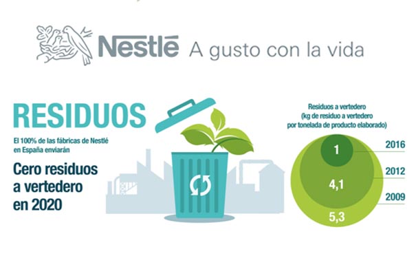 En la actualidad, cinco de las diez plantas industriales de Nestlé en España —en concreto, las de agua embotellada en Viladrau (Girona) y Herrera del Duque (Badajoz), la fábrica de café tostado de Reus (Tarragona), la fábrica de café soluble y bebidas en cápsulas monodosis de Girona y la de salsas de tomate en Miajadas (Cáceres)— ya son consideradas “cero residuos a vertedero”, al minimizar la generación de los mismos y fomentar su reutilización, reciclaje o valorización.