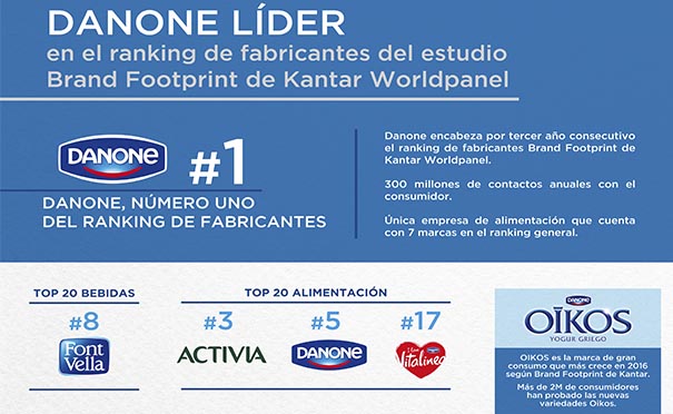 Danone lidera por tercer año consecutivo la primera posición en el ranking general de Kantar Worldpanel sobre fabricantes Brand Footprint. Según el estudio, Oikos ha sido la segunda marca con mayor crecimiento en 2016.