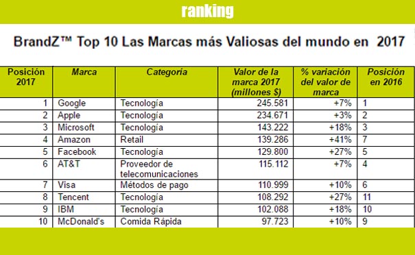 Los 5 gigantes Google, Apple, Microsoft, Amazon y Facebook se sitúan en el top5 del ranking presentado por Kantar Millward Brown y WPP. Google, Apple y Microsoft se mantienen en las 3 primeras posiciones, y ven crecer su valor de marca un 7%, 3% y 18% respectivamente en el último año, alcanzando un valor de 245.600 millones de dólares Google, 234.700 millones Apple y 143.200 millones de dólares Microsoft.
