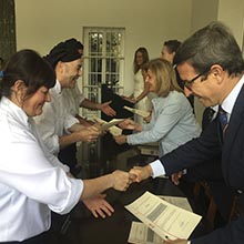 La ministra y el presidente de la Fundación Cruzcampo han entregado los diplomas a los 30 alumnos que, tras tres meses de formación, han finalizado los cursos de Operaciones básicas de cocina y Operaciones básicas de restaurante y bar realizados por personas con discapacidad física. Sigue en marcha el curso de Ayudante de Cocina compuesto por discapacitados psíquicos que finalizará en el próximo mes de abril.
