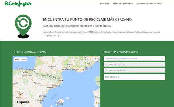 A través de la página, la empresa pone sus centros a disposición de los clientes para que puedan depositar sus residuos de aparatos eléctricos y electrónicos. El Corte Inglés comenzó a instalar contenedores en 2016 para el reciclaje de pequeños aparatos electrodomésticos (PAE) en sus centros, tras la buena acogida que tuvo una experiencia piloto puesta en marcha previamente en algunos de los establecimientos. Además, también facilitará información sobre los puntos de recogida municipales más cercanos.