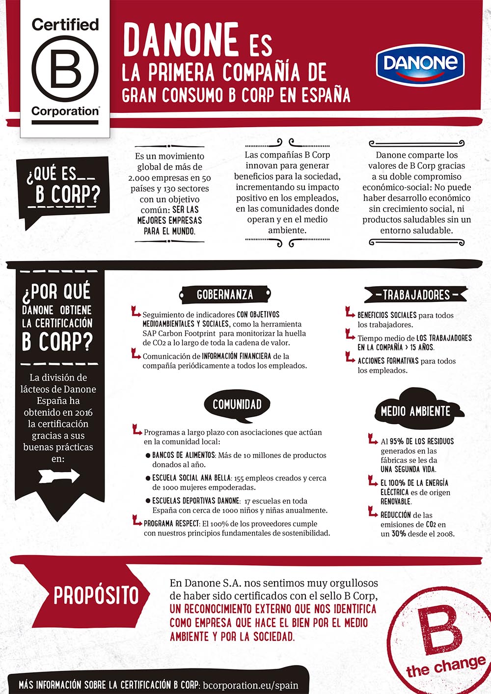 Danone comparte los valores de B Corp gracias a su doble proyecto económico-social. En 1972 Antoine Riboud, presidente de Danone, sostenía que “no puede haber desarrollo económico sin crecimiento social”. De la unión de esos dos conceptos nació un ideal que impregnó desde su creación el ADN de la compañía.