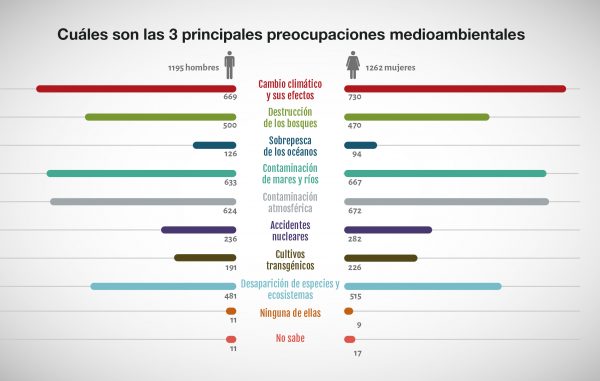 Greenpeace revela que para la ciudadanía el cambio climático ya es la principal preocupación medioambiental, siendo destacado por el 55,8% de los encuestados; seguida de la contaminación de mares y ríos (51,9%) y la contaminación ambiental (51,7%), lo que demuestra que la gravedad de los impactos del cambio climático ha calado ya en la sociedad.