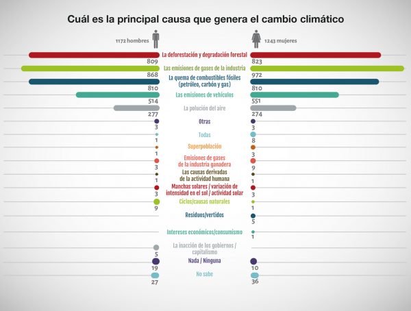 Asimismo, Greenpeace destaca que la mayoría de las personas encuestadas identifica que entre las tres principales causas del cambio climático están las emisiones industriales (73,5%), la deforestación (65,1%) y la combustión de combustibles fósiles (64,6%).