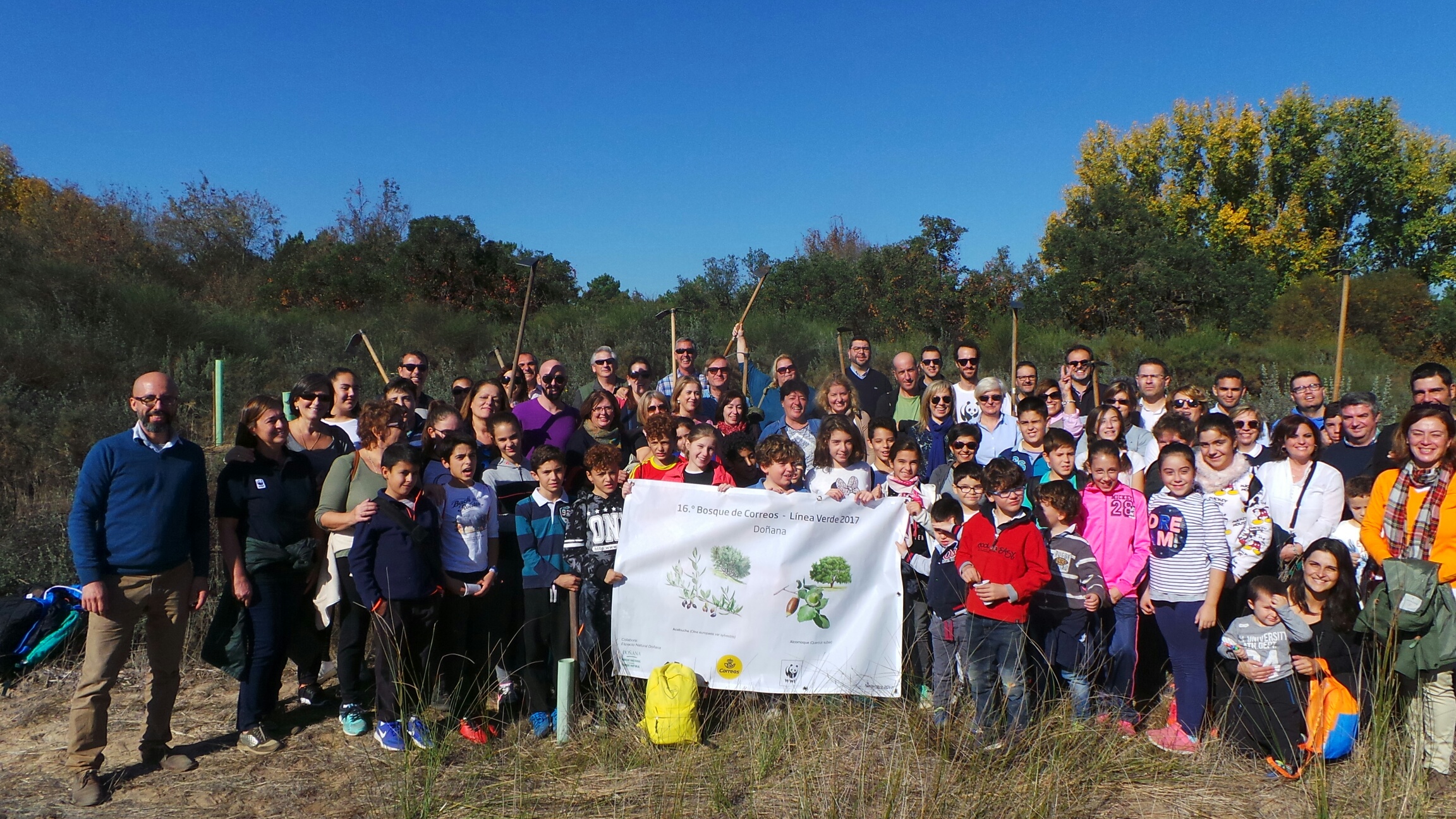 Los últimos 200 árboles del nuevo bosque de Correos han sido plantados por sus voluntarios -entre empleados y sus familiares- y una veintena de alumnos del colegio “Doñana”. Con esta actividad se completa la recuperación de 5 hectáreas de alcornocales en la ribera de La Rocina, donde se han sembrado 3.000 plantones de especies autóctonas para mejorar la conservación de un arroyo que ejerce gran influencia sobre el buen estado ecológico de la marisma de Doñana.