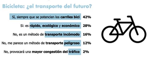 Asimismo, un 16% opina además que las bicicletas son incómodas. Por último, un 2% tiene claro que las bicicletas provocarán una mayor congestión del tráfico en las ciudades.