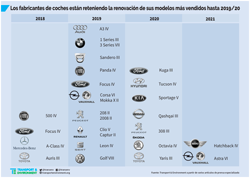 Se espera que solo cuatro de los 50 modelos más vendidos se actualicen antes de finales de este año, seguidos de 14 vehículos en 2019, y 7 en 2020. T&E afirma que lo habitual son siete mejoras por año entre los 50 modelos más vendidos.