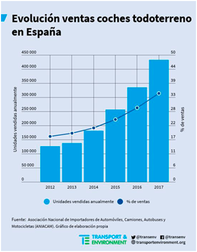 El análisis también concluye que las crecientes ventas de SUV (todoterrenos)- cuya cuota de mercado aumentó del 4% en 2001 al 26% en 2016 a nivel europeo y del 16,6% en 2011 al 34,8% en 2017 en el caso de España-, así como los motores más potentes, han sido en gran parte responsables del aumento de las emisiones de los automóviles.