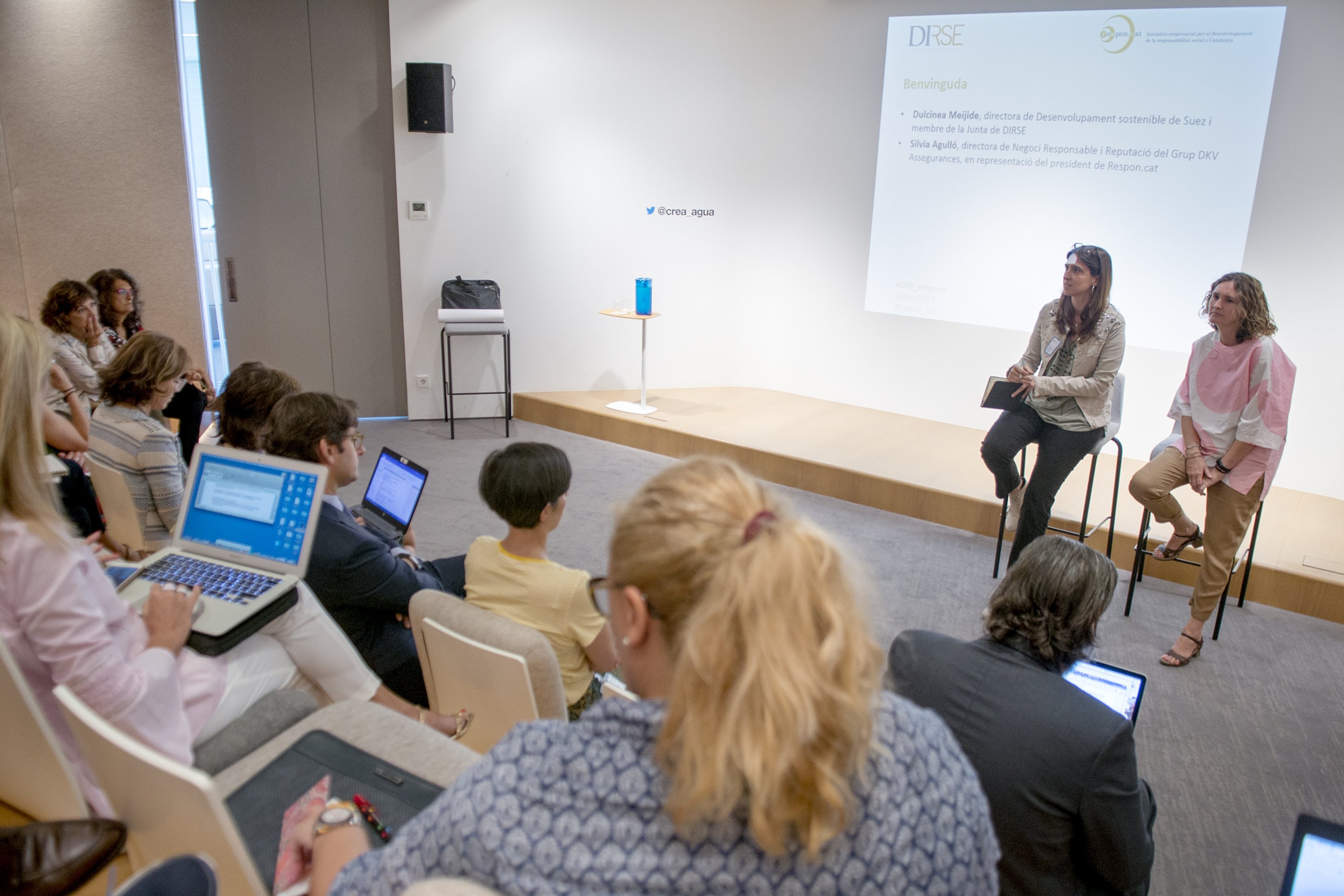 Dulcinea Meijide, directora de Desarrollo sostenible de Suez y delegada de DIRSE en Cataluña, y Silvia Agulló, directora de Negocio Responsable y Reputación del Grupo DKV Seguros, en representación de Respon.cat, inauguraron la jornada, destacando el convenio de colaboración que ambas asociaciones mantienen y que ha dado fruto, entre otras actuaciones, a esta jornada.
