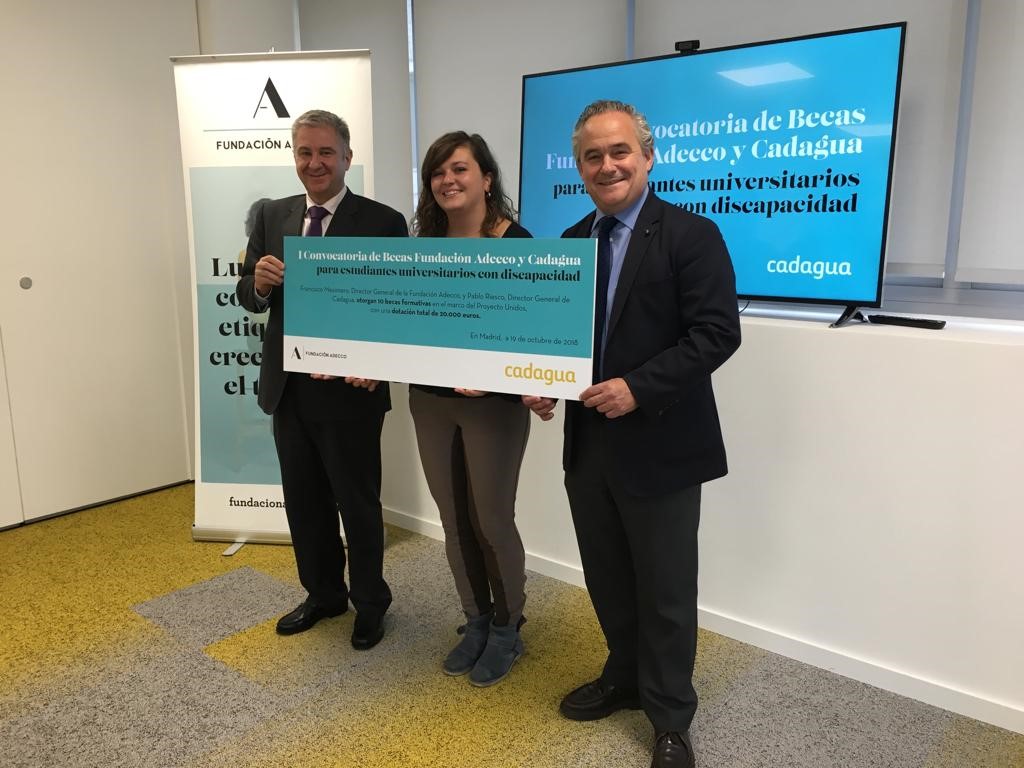 En el acto Francisco Mesonero, director general de la Fundación Adecco y Pablo Riesco, director general de Cadagua, han hecho entrega de un cheque simbólico de 20.000€, valor total de las 9 becas, a Verónica Íñigo, que ha acudido en representación de los beneficiarios becados. Estas becas se enmarcan en el Proyecto Unidos, que Fundación Adecco y Cadagua llevan a cabo con el objetivo de promover la inclusión laboral de personas con discapacidad.