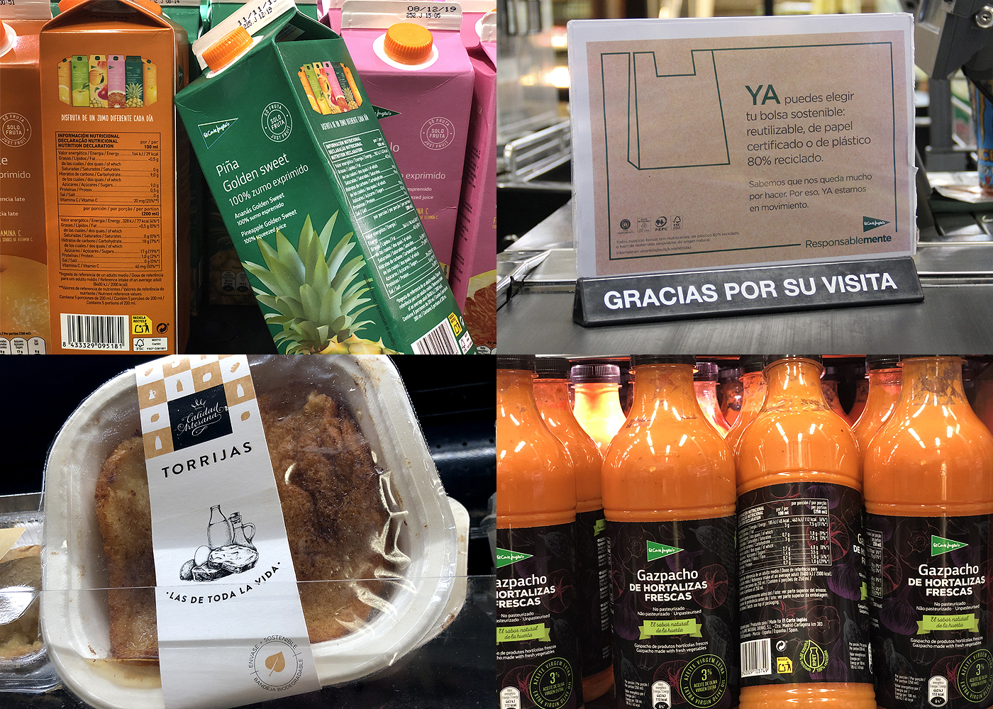 Dentro de la gama de marca propia, destacan las botellas de zumos, gazpacho y aceites, fabricadas con un 25-30% de material reciclado, así como los bricks de leche, zumos o batidos, cuyo cartón está certificado por FSC.