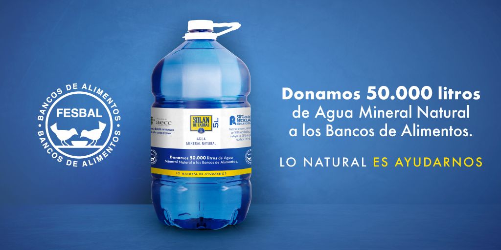 Además de esta donación, Solán de Cabras impulsa un precio especial en su formato envase de 5 litros, apostando como siempre ha hecho por trasladar así la naturaleza del agua mineral natural del manantial de Solán de Cabras a todas las casas, y poder disfrutar del bienestar que aporta su agua mineral natural.