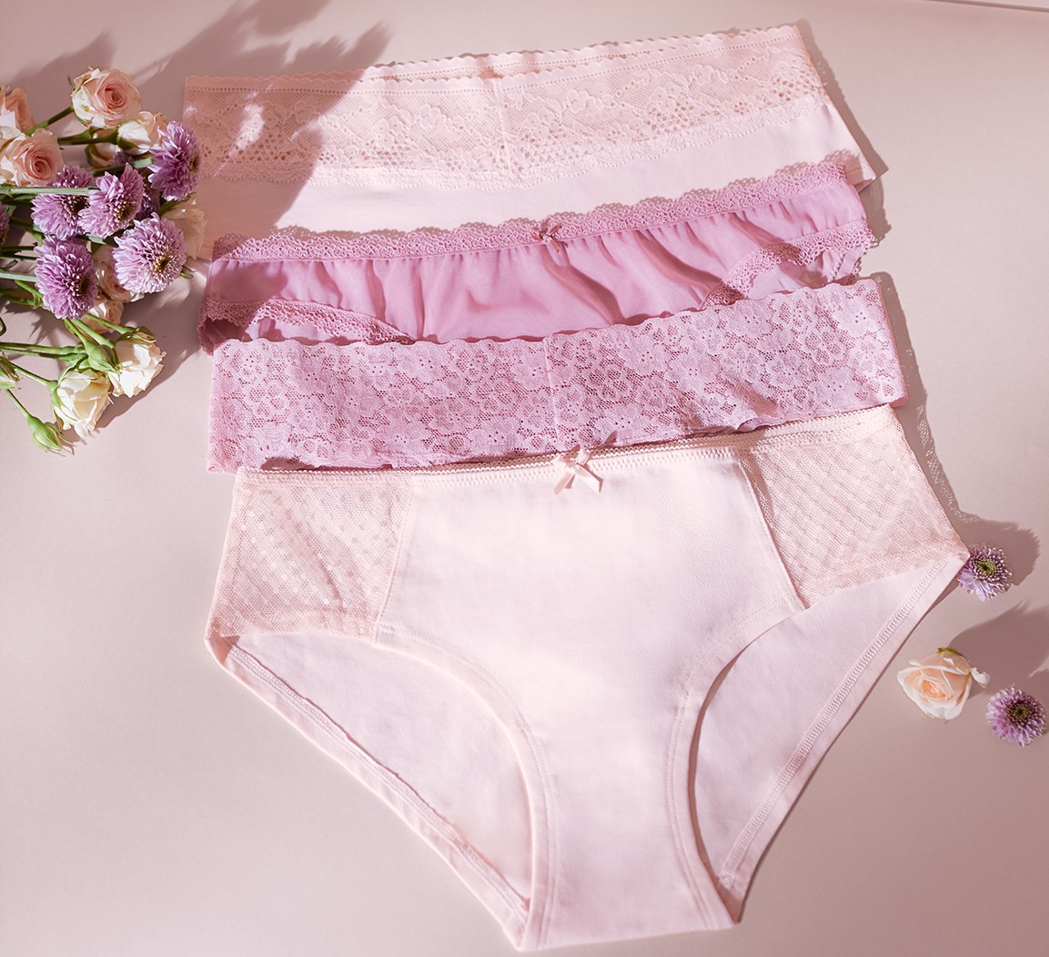 La colección de 4 braguitas está diseñada en diferentes patrones para que cada clienta pueda encontrar su favorita: braguita brasileña, braguita tanga, braguita ancha y braguita ancha brasileña. Todas ellas en diferentes tonalidades de rosa –desde el tono rosa pastel hasta tonos más subidos como el “fresa”– y en diferentes materiales: de tul, de helankas con encaje floral, de algodón con estructura de plumetti y de algodón con encaje.