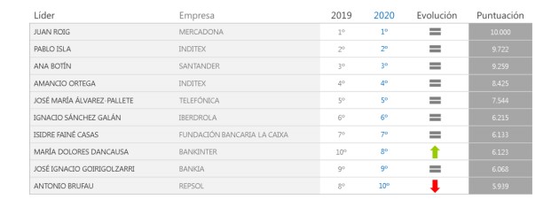 En los resultados de Merco Líderes 2020, por segundo año consecutivo, el directivo con mayor reputación de España es Juan Roig (1º) [Mercadona]; seguido de Pablo Isla (2º) [Inditex]; Ana Botín (3º) [Santander]; Amancio Ortega (4º) [Inditex]; José María Álvarez-Pallete (5º) [Telefónica]; Ignacio Sánchez Galán (6º) [Iberdrola]; Isidre Fainé Casas (7º) [Fundación Bancaria La Caixa]; María Dolores Dancausa (8º) [Bankinter], que sube dos puestos respecto a 2019; José Ignacio Goirigolzarri (9º) [Bankia]; y Antonio Brufau (10º) [Repsol].
