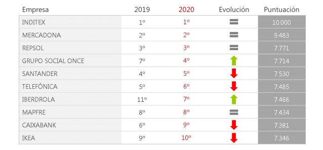 Un año más, y ya van nueve, Inditex (1º) se sitúa a la cabeza de las empresas más reputadas de nuestro país en el ranking Merco Empresas, seguida de Mercadona (2º) y Repsol (3º), que mantienen las mismas posiciones que en 2019. El top 10 lo completan Grupo Social Once (4º), Santander (5º), Telefónica (6º), Iberdrola -que pasa del 11º al 7º-, Mapfre (8º), CaixaBank (9º) e Ikea (10º).