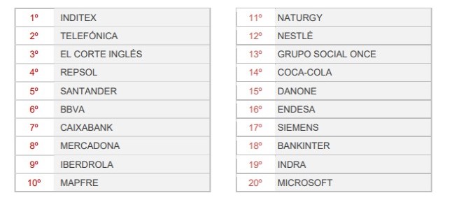 Entre las principales subidas de esta 20ª edición destacan la de Correos, que pasa del puesto 100º al 43º; Endesa, del 76º al 38º; Bayer, del 84º al 59º; EY (Ernst & Young), del 98º al 78º; Netflix, del 56º al 40º;y Orange, del 82º al 69º. Cabe señalar las incorporaciones al ranking de Holaluz (100º), Cuatrecasas (95º), Roche (94º), Adidas (77º), Tesla (76º), Enagás (70º), Lidl (61º) y HP (41º).