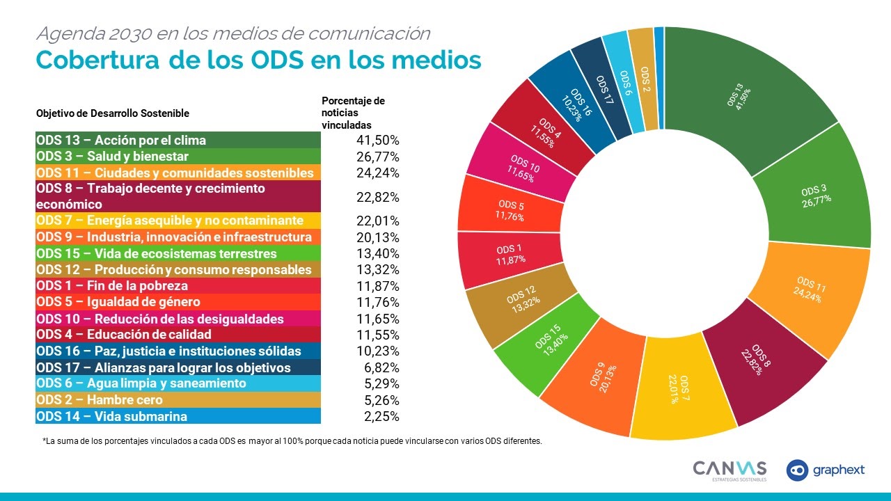 En cuanto a los Objetivos de Desarrollo Sostenible, los cinco con mayor presencia en los medios en este periodo son, por este orden: ODS 13. Acción por el clima (41,5%), ODS 3. Salud y bienestar (26,7%), por influencia directa de la pandemia; ODS 11. Ciudades y comunidades sostenibles (24,2%), ODS 8. Trabajo decente y crecimiento económico (22,8%) y ODS 7. Energía asequible y no contaminante (22%). Por el contrario, los ODS 1. Lucha contra la pobreza (11,8%), ODS 5. Igualdad de Género (11,7%), ODS 10. Reducción de las desigualdades (11,6%), ODS 4. Educación de calidad (11,5%), y ODS 2. Hambre cero (5,2%) presentan una cobertura muy inferior.